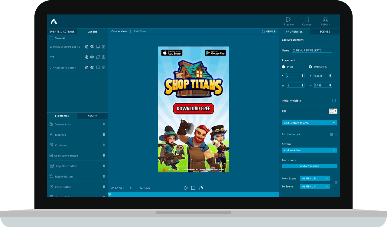 AppOmboard Studio is a mobile app design software that allows users to create interactive experiences. The platform features an easy-to-use interface that enables users to quickly create playable ads and instant apps without writing any code. You can also grow your app creating playable ads and instant apps at scale. Once your project is complete, you can share your interactive project on social, with friends and colleagues directly. Instant apps and playable ads built by Studio include Marvel Strike Force, Guns of Boom, Yarn, and more.