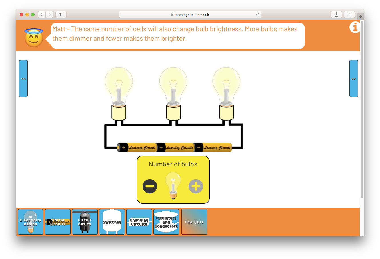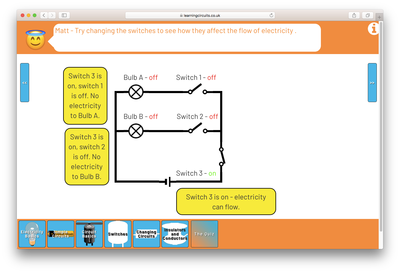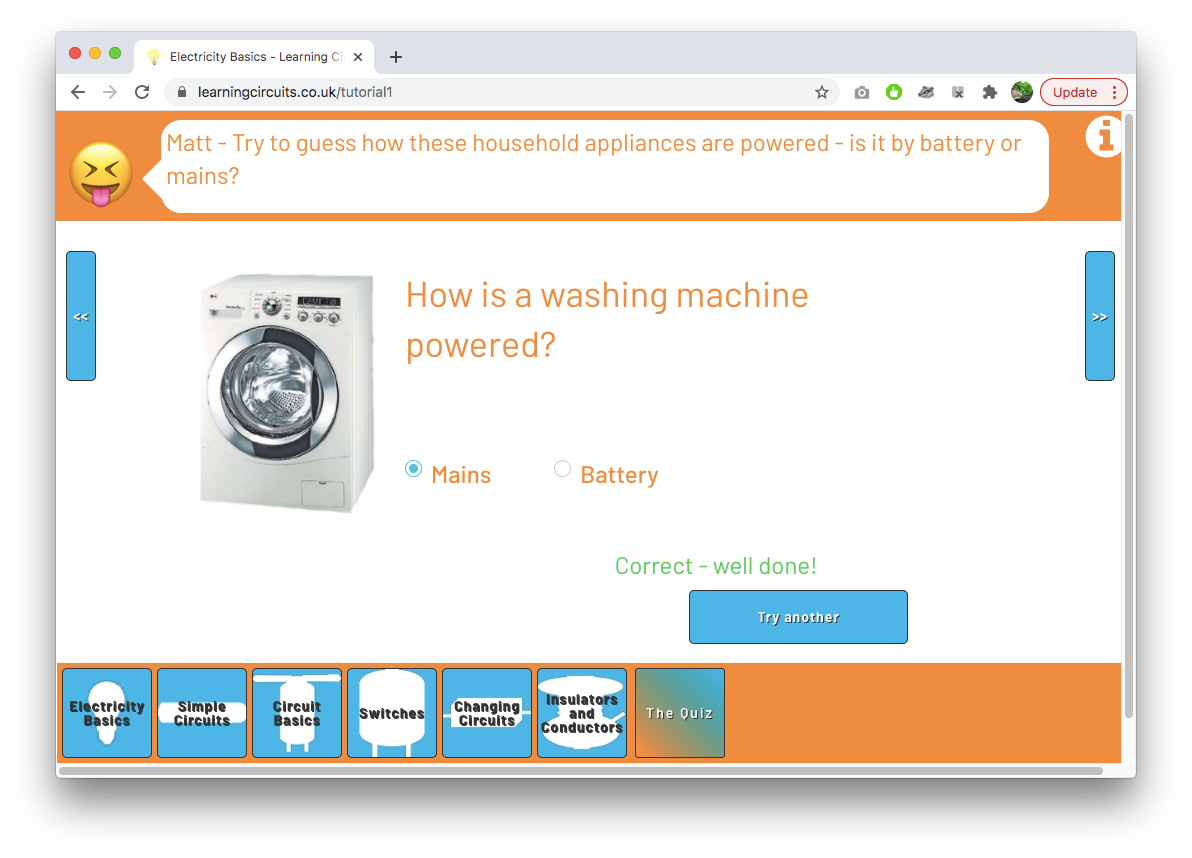 Learning Circuits teaches children and young people about the basics of electricity and circuits. It uses interactive tutorials to guide learners through different parts of the 4th grade (US) / Key Stage 2 (UK) curriculum. It features such as; explaining basic circuits, types of power source, types of appliance, different circuits, how switches work, safety & how to change components in a circuit. There is a quiz and an interactive circuit builder for learners to test their knowledge and practice their skills and understanding.