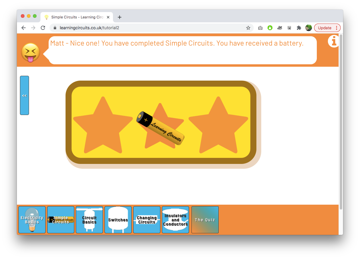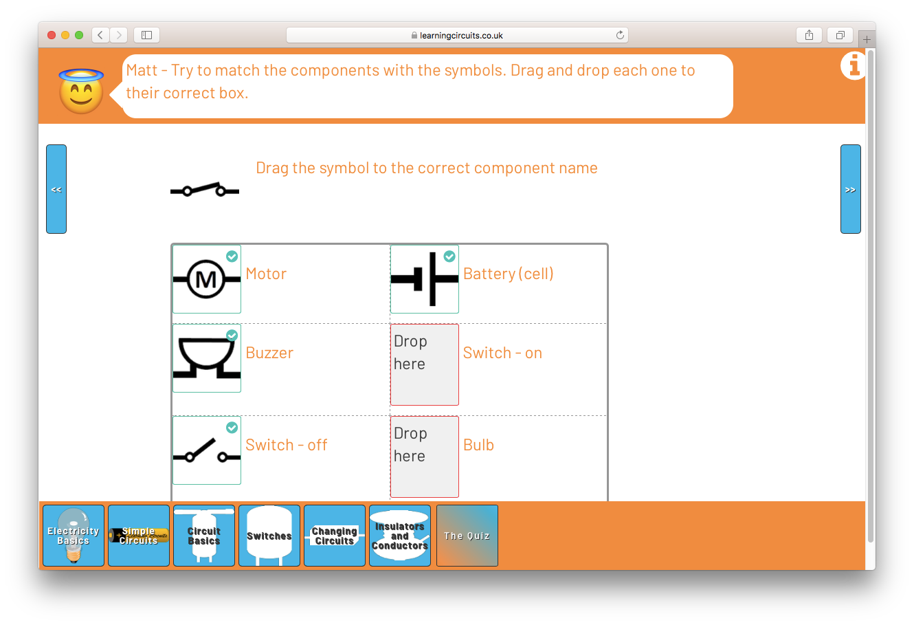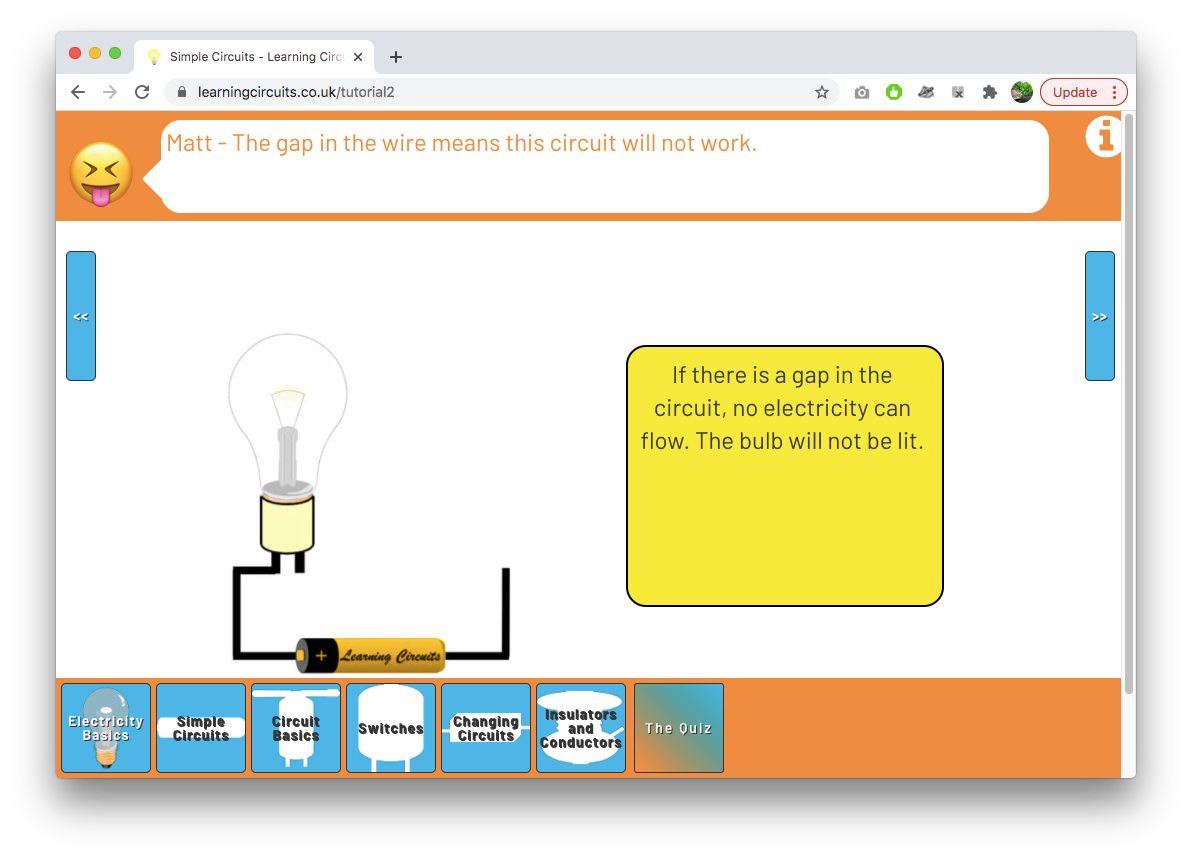 Learning Circuits teaches children and young people about the basics of electricity and circuits. It uses interactive tutorials to guide learners through different parts of the 4th grade (US) / Key Stage 2 (UK) curriculum. It features such as; explaining basic circuits, types of power source, types of appliance, different circuits, how switches work, safety & how to change components in a circuit. There is a quiz and an interactive circuit builder for learners to test their knowledge and practice their skills and understanding.