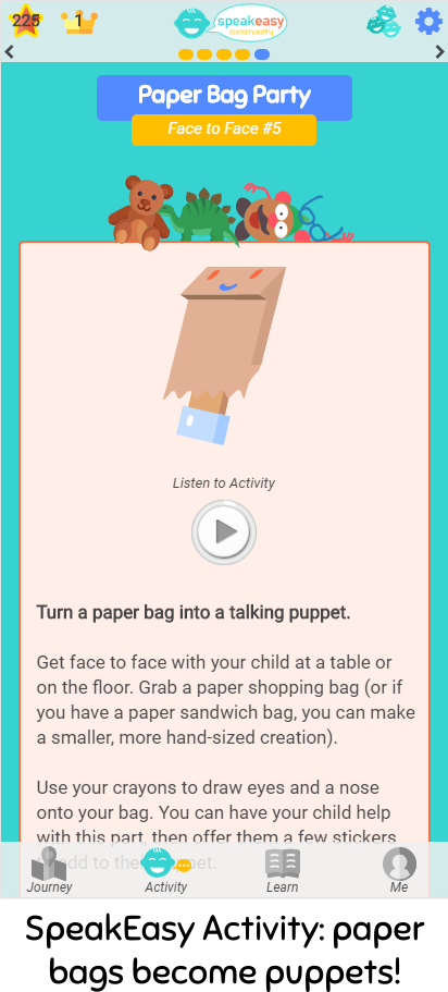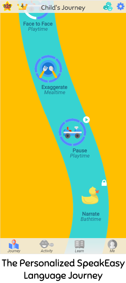 SpeakEasy helps parents boost the speech and language development of their children, from birth-to-five. We empower parents with evidence-based activities and effective teaching techniques, all written by a speech therapist. The SpeakEasy Language Journey is customized to the language stage of their child, and is built for parents of children with or without speech delay.