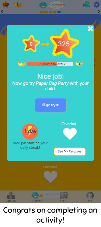 New users answer a few questions to place their child in a language developmental level (E.g. "Does your child combine two or more words?") and then create an account. We offer a free trial to our subscription service, SpeakEasy Unlimited, so that parents can try out the app to see how it will help them. Once they are in the app, we have tutorials that guide users to actions including:-Watch language technique videos, covering topics such as getting Face to Face with your child-View at-home activity ideas, including why each one works and how to adjust it for your child's needs-Read interactive articles about speech and language development-Track their child's language skills and development, and 'level up' to more advanced activities when appropriate