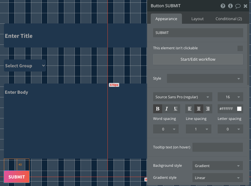 Once a user has written their post title, selected the relevant group, and written the body of their post, they’ll click the submit button to create a new post in your database. Clicking this button will be the necessary action to trigger your workflow.