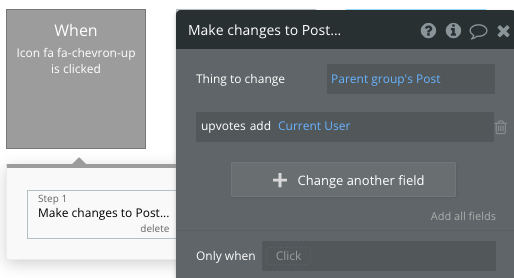 To allow a user to upvote a post, we’ll need to add a workflow action. If a user clicks on the “up” icon, we’ll add that user to that post’s upvotes list.