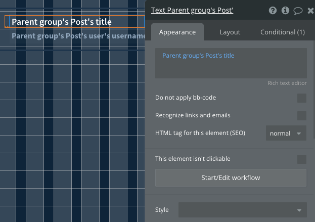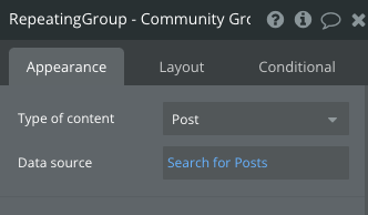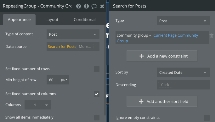 We’re only going to display posts in this repeating group if their “Community Group” is equal to the current page’s Community Group.