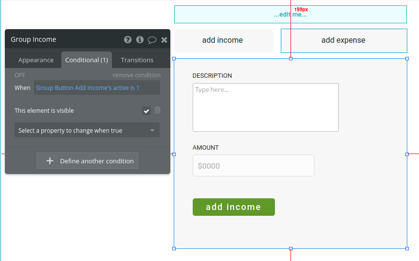 Define a new condition. We will pick up the custom state we created on the button to add income (“Group Button Add Income” in this case). Set it that when “Group Button Add Income” > “’s active” > “is” and then type “2”.