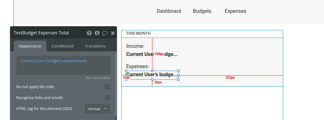 It would be useful to show if the user is saving or losing money this month. Add a text element to show the amount left over. We’ll do a calculation in the text field, where we’ll have the expenses subtracted from the income. To do this, insert dynamic data and choose “Current user” > “’s budget” > “’s income total” > “-” > “Current user” > “’s budget” > “ ‘s expense total.”