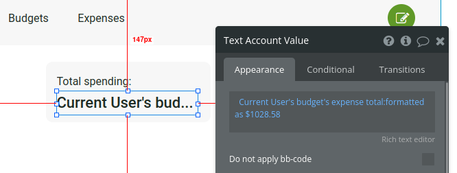 Next, add a text field to show the total amount spent. Add dynamic data: “Current user” > “’s budget” > “’s expense total” > “:formatted as” > “Currency”.