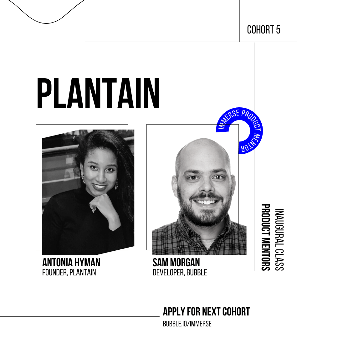 "My product mentor has been fully invested in helping me bring Plantain to life. His knowledge of Bubble and willingness to volunteer his time has been an invaluable resource." - Antonia Hyman, founder of Plantain