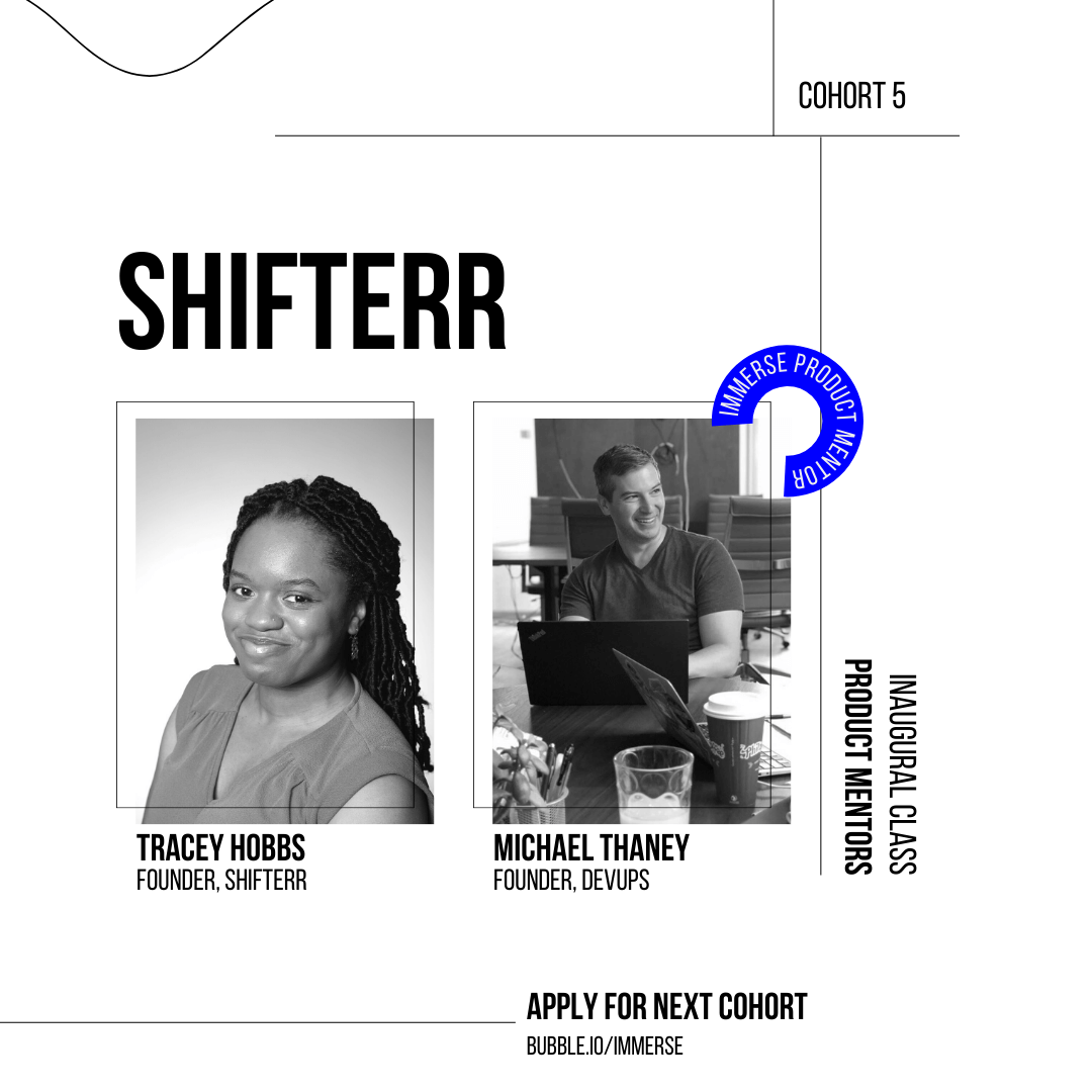 “My product mentor has been helpful in getting me to talk through how I was structuring my pages and sending info from one page to the next. That helped to fix my issue with certain repeating groups not showing up.” - Tracey Hobbs, founder of Shifterr