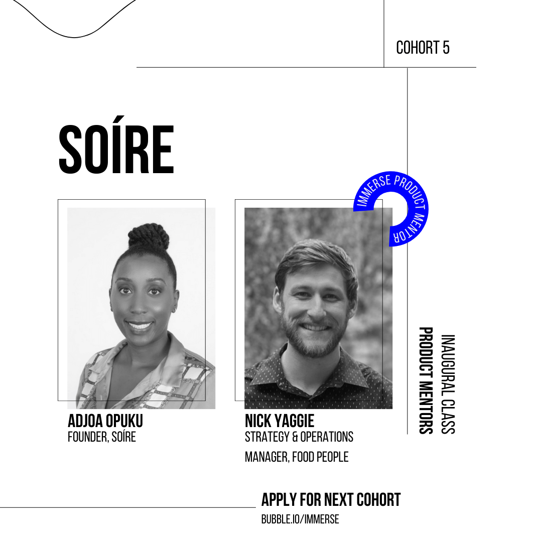 "The consistent, focused help from someone who not only knows Bubble, but also the restaurant market has made creating my product so much more efficient. Learning best practices on building for responsive design has made designing a page intuitive and his guidance has shortened the learning curve for mastering workflows. I’m feeling more and more confident with each session." - Adjoa Opuku, founder of Soiré