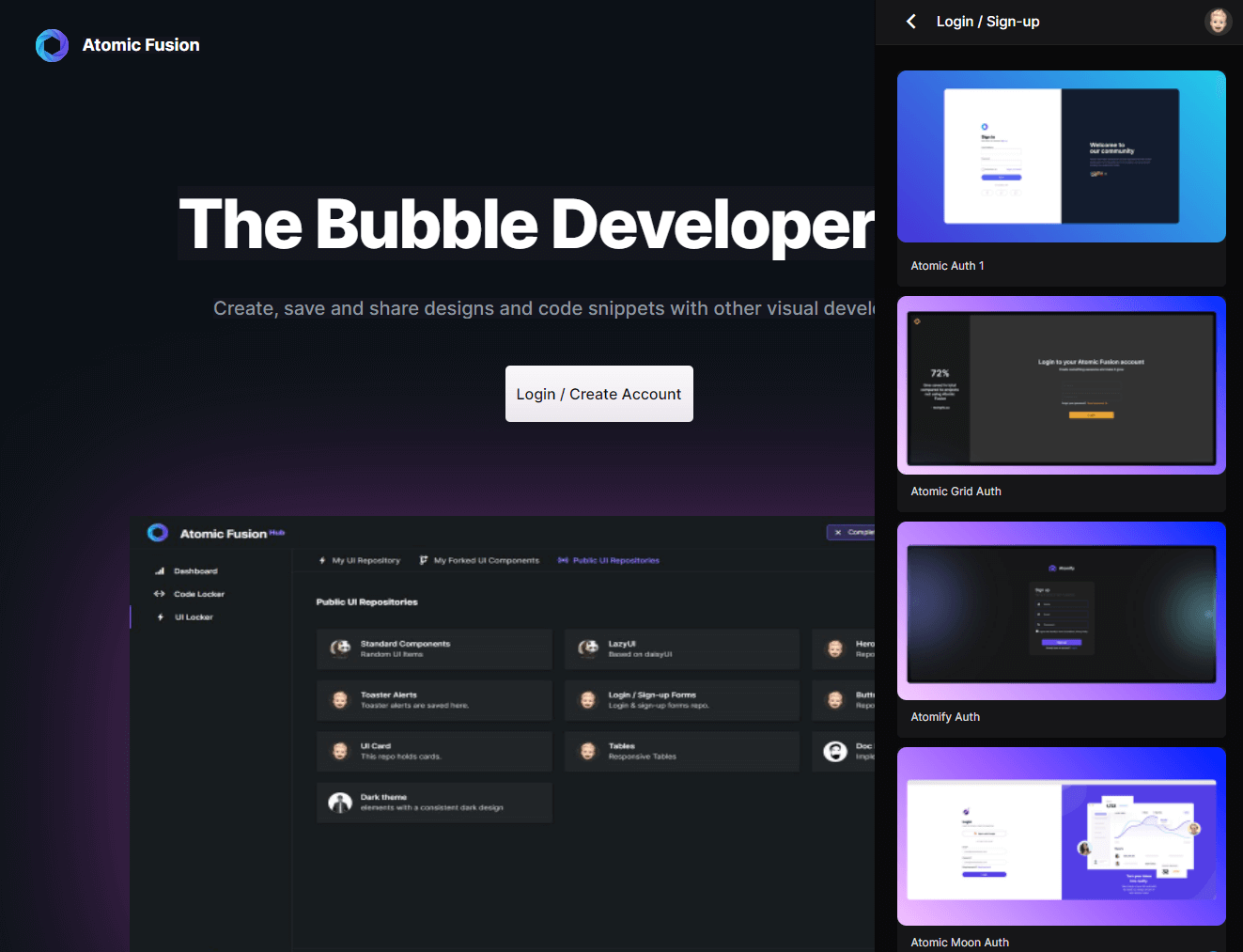 My most exciting Bubble project has by far been Atomic Fusion. Atomic Fusion is a Google Chrome extension and hub experience that allows users to easily save, share and reuse Bubble components and. Atomic Fusion speeds up Bubble development time significantly when building your front-end. There are a few other features as well, including saving code snippets for reuse and the ability to share them publicly.
