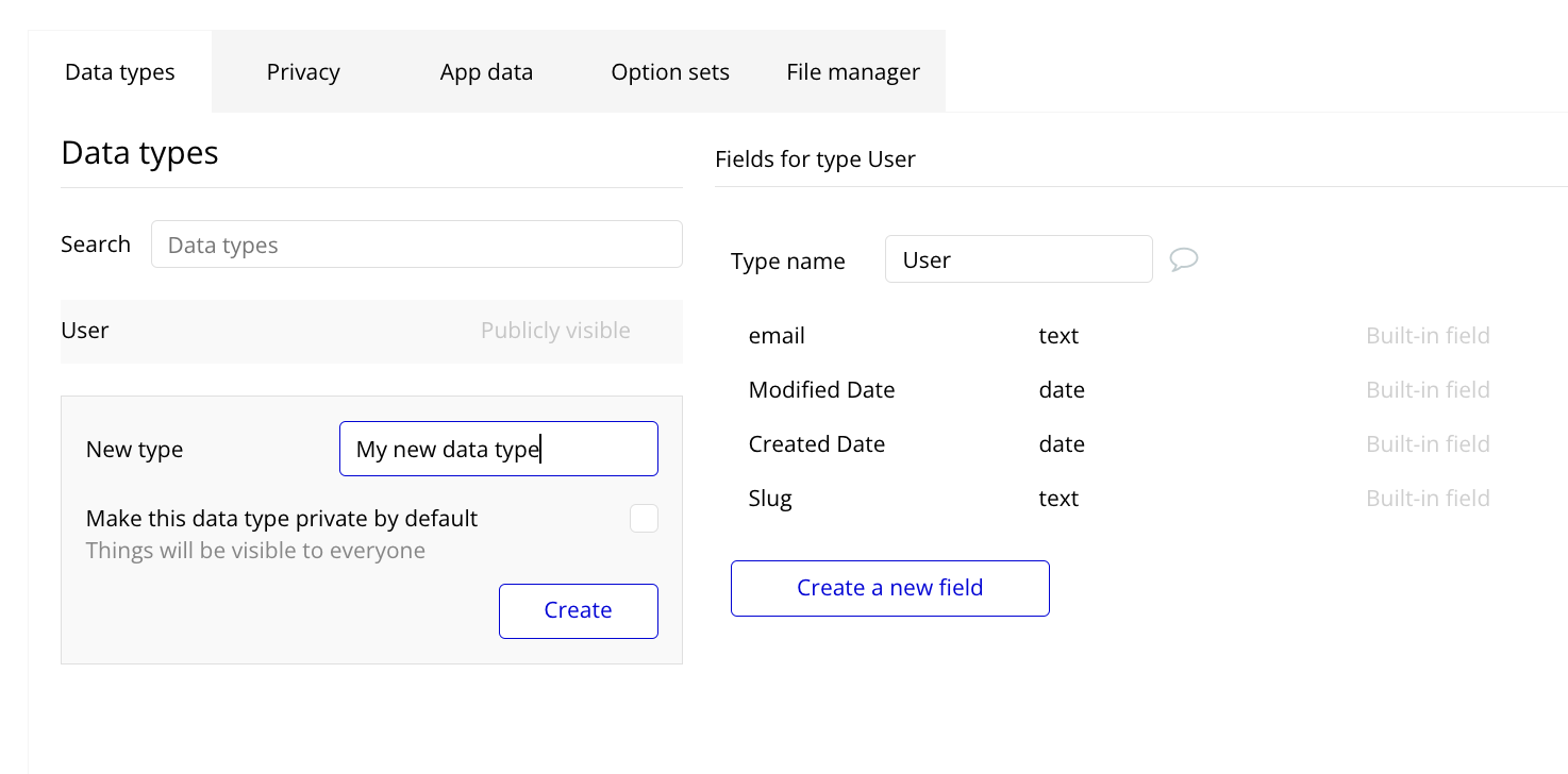Bubble’s data types are also equivalent to “tables” in a traditional database. All Bubble data types can have a custom name. For example, a social media app could have data types for “User,” “Post,” and “Comment.” (FYI, every Bubble app has a built-in User data type.)