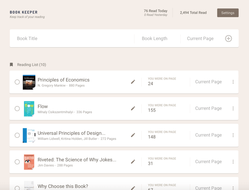 Book Keeper performs a simple job: allows you to input a book you’re reading, then track your page location and notes as you read.