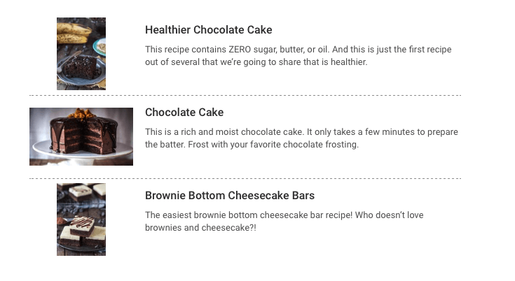 To make it work, you want to give it a set of datatypes that it will display row by row. For example, if we call the Cake dataset, which houses all of our different cakes, we can display each of the individual cakes in order using the same formatting.