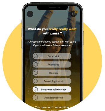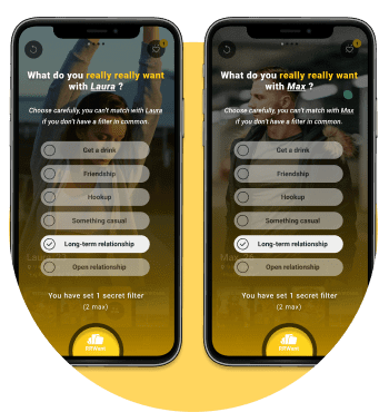 Whenever a user of RRW has the possibility to match with someone else, they are provided with six different filters expressing expectations: Something casual, Get a drink, Friendship, Long-term relationship, Open relationship and Hookup. The user journey looks like this: