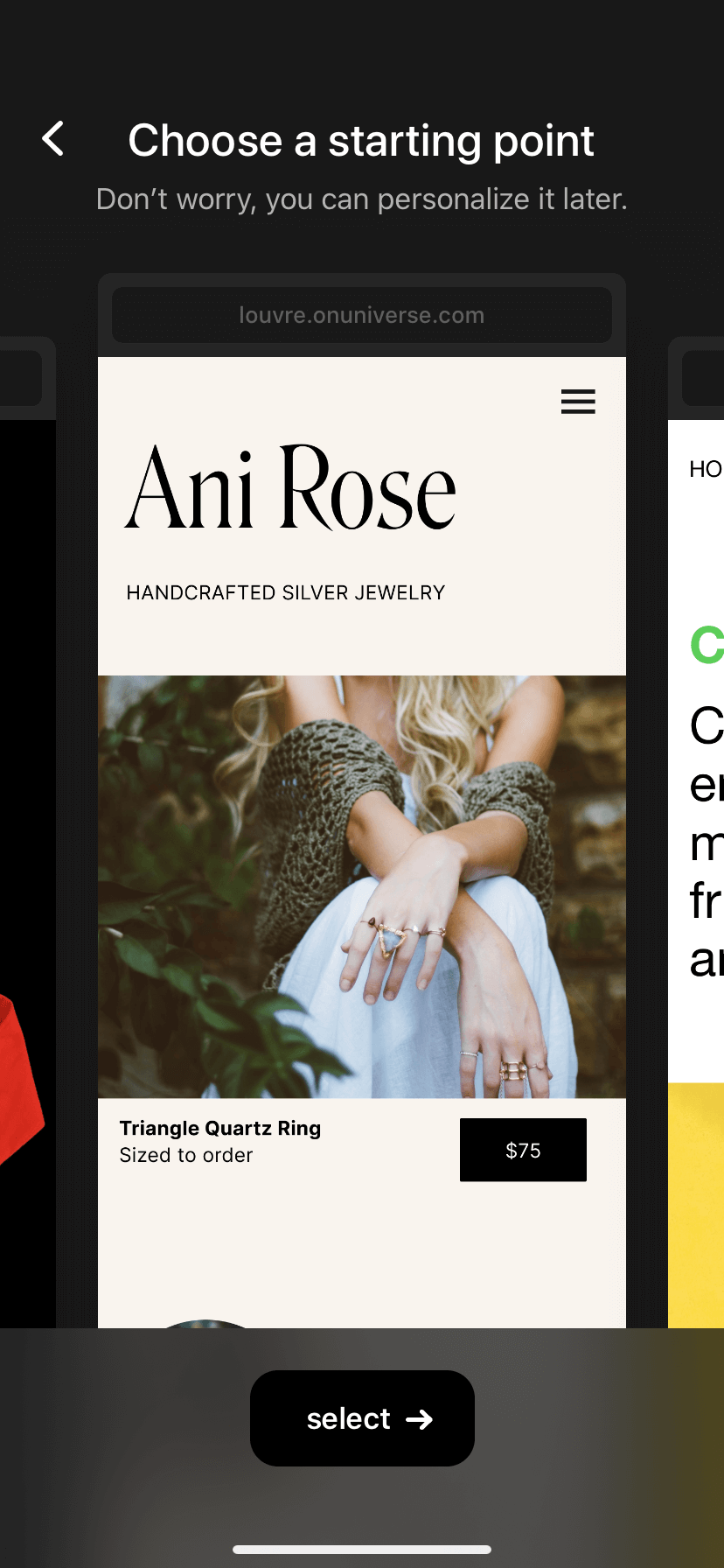 When users download the Universe app, they’re given the option to choose a domain name, but can only secure that domain if they choose to sign up for the Pro plan. From here, Universe users have a number of options to choose from when starting their site-building journey, including importing an instagram profile (a useful tool for those who may have an audience in place already). Users can also choose from a variety of templates, including a generic online marketplace, a local business, a portfolio, professional services and more. Once Universe users choose their template they’re prompted to answer a few more questions and can start editing their template.